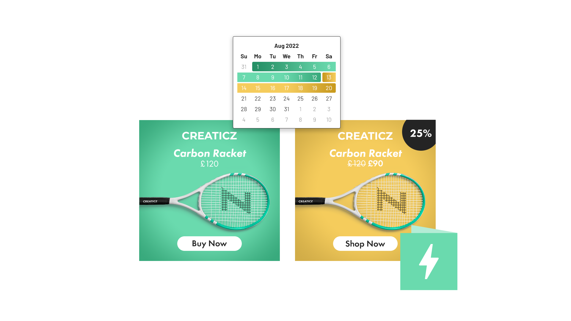 Changes to your data source are updated within 15 minutes and your creatives are automatically updated - while they are still live.